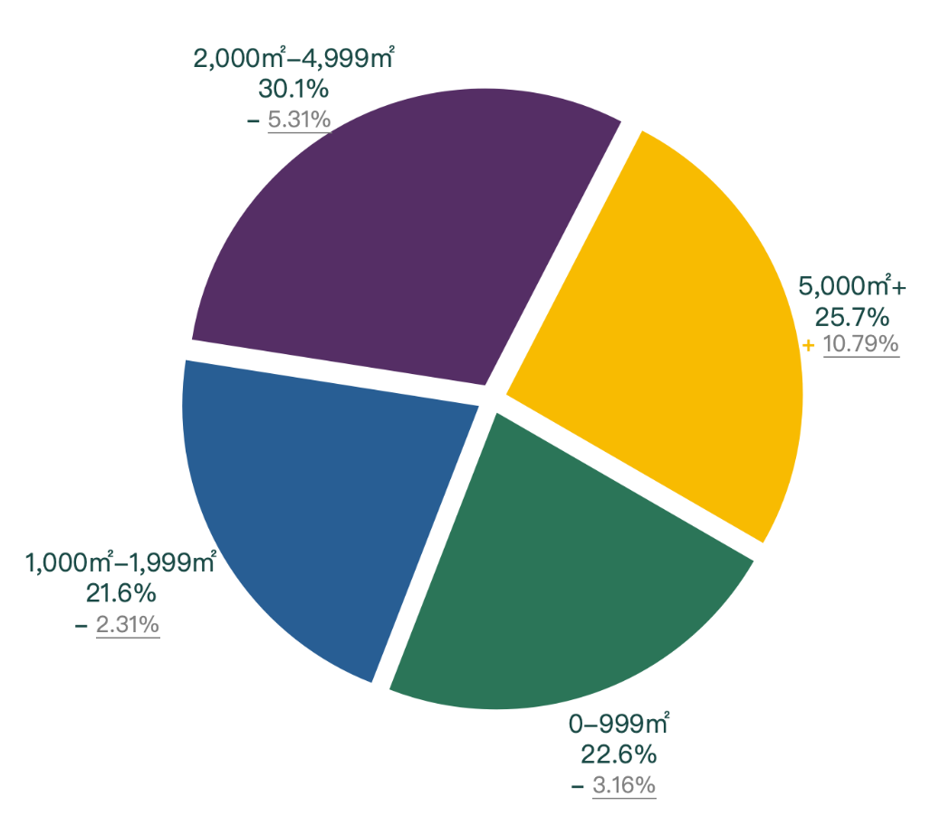 從本季度寫字樓成交面積來看,本季度2,000-4,999平方米的成交面積占比最大,為30.1%;超過5,000平方米的成交面積占比為25.7%,環(huán)比上升10.79個百分點;0-999平方米的成交面積占比為22.6%,環(huán)比降低3.16個百分點;1,000-1,999平方米的成交面積占比為21.6%,環(huán)比降低2.31個百分點。