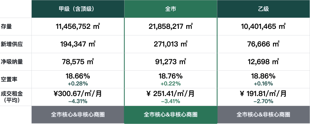 從樓宇等級成交面積來看,各等級寫字樓成交面積對比上季度均有上升,頂級寫字樓變化較小,甲級寫字樓成交面積環(huán)比上升超9萬平方米,乙級寫字樓成交面積環(huán)比上季度上升超4萬平方米。