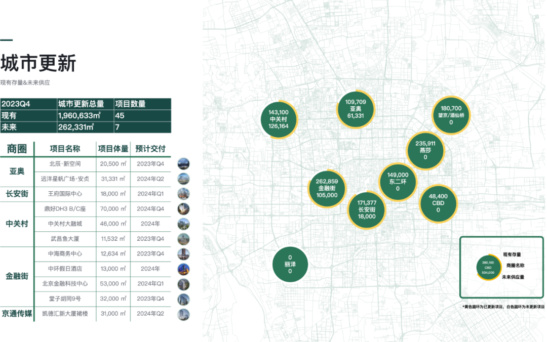 從城市更新項目來看,2023年全年有6個城市更新項目入市,為中關(guān)村、金融街、望京/酒仙橋和亞奧寫字樓市場帶來超過23.5萬平方米的新增供應(yīng)量;預(yù)計2024年仍將有7個城市更新項目投入市場。