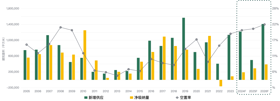 本年度凈吸納量上半年連續(xù)錄得負值,明顯低于市場預(yù)期,在市場預(yù)期降低租金連續(xù)下行的助推下,下半年凈吸納量由負轉(zhuǎn)正逐漸回暖。短期內(nèi)市場天平將繼續(xù)向租戶方傾斜,預(yù)測2024年仍將是企業(yè)抄底的良好時機。