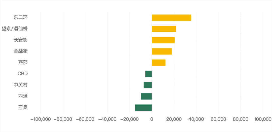 從各商圈成交面積來看,東二環(huán)、望京/酒仙橋、長安街、金融街、燕莎商圈本季度表現(xiàn)均有上升,上述商圈本季度成交面積環(huán)比上季度上升超過1萬平方米;CBD、中關(guān)村、麗澤及亞奧商圈成交面積環(huán)比上季度有所降低,其中亞奧商圈成交面積環(huán)比上季度降低超1萬平方米。
