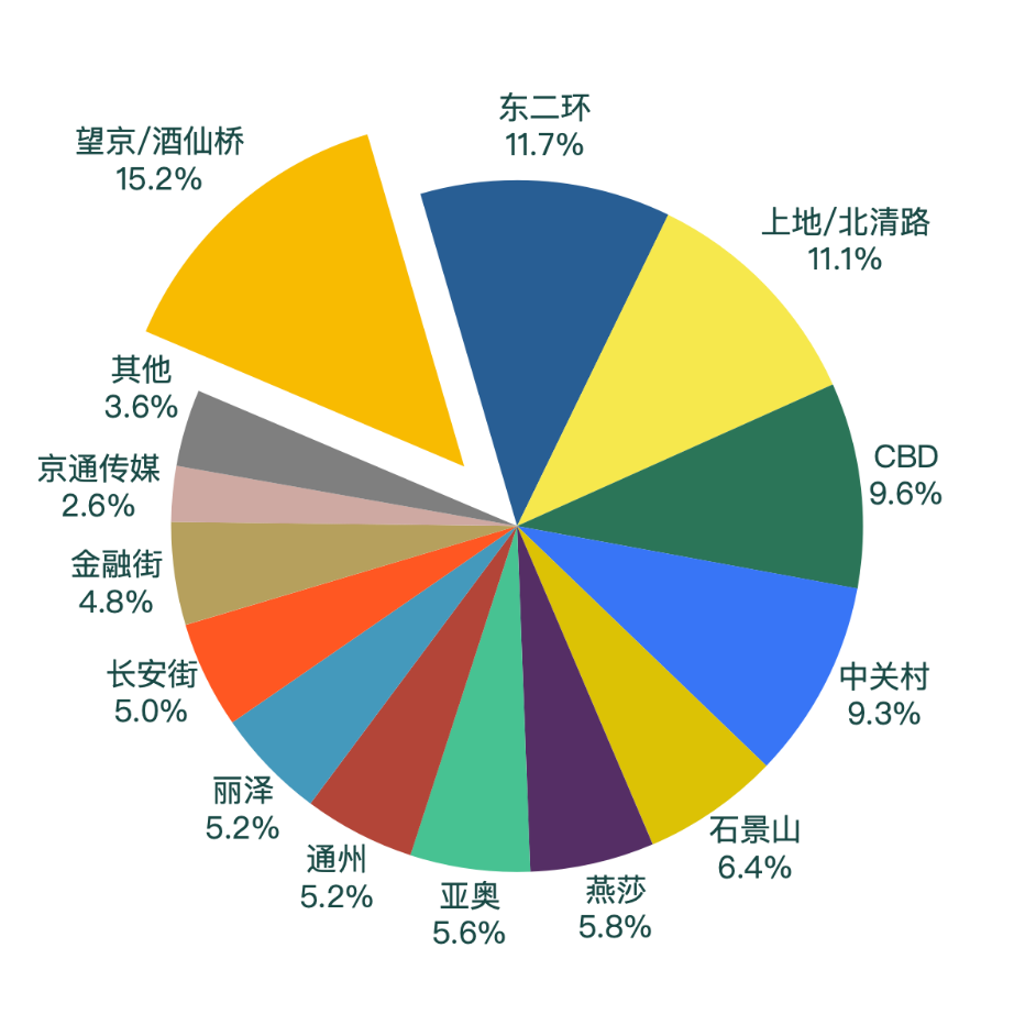 2023年第四季度,望京/酒仙橋、東二環(huán)、上地/北清路、CBD、中關(guān)村商圈是本季度成交的熱點區(qū)域,占比超過全市成交面積的50%。望京/酒仙橋商圈在本季度成交面積占比為15.2%,東二環(huán)商圈成交面積占比為11.7%,上地/北清路商圈成交面積占比為11.1%,CBD商圈成交面積占比為9.6%。