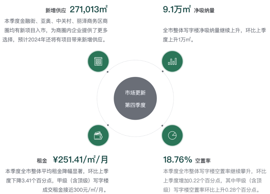 2023年第四季度全市整體寫字樓空置率繼續(xù)攀升,環(huán)比上季度增加0.22個百分點,其中甲級(含頂級)寫字樓空置率環(huán)比上升0.28個百分點。全市整體平均租金仍未止住收窄態(tài)勢,環(huán)比下降3.41個百分點,甲級(含頂級)寫字樓成交租金環(huán)比降低4.31個百分點,接近每平方米每月300元。