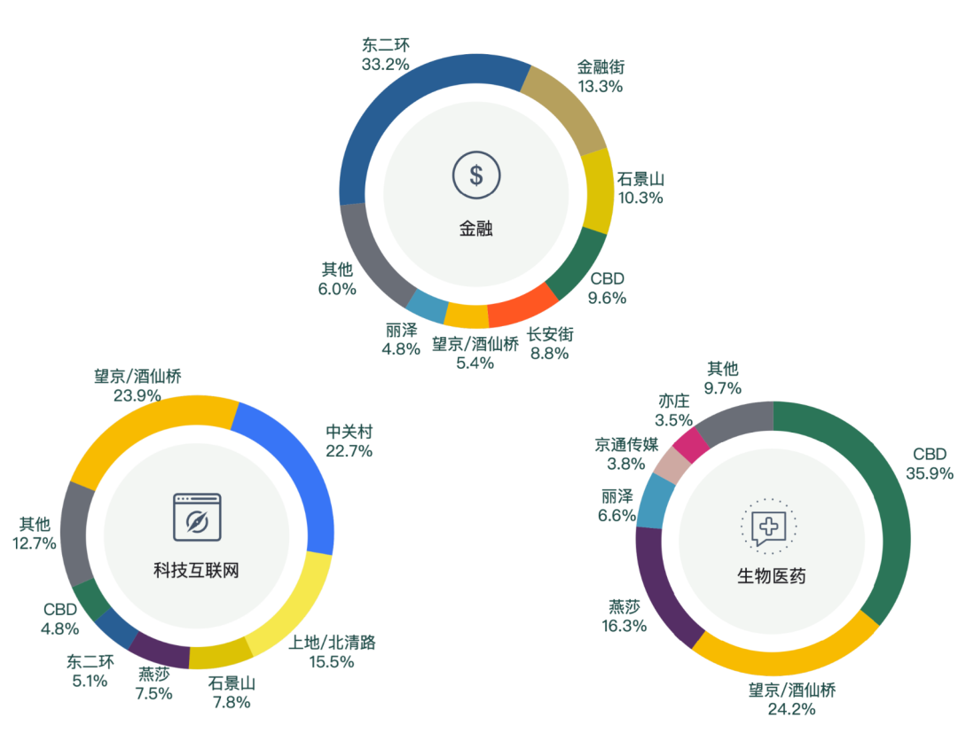 2023年第四季度科技互聯(lián)網(wǎng)行業(yè)在望京/酒仙橋及中關(guān)村商圈成交面積占比顯著,約為全市的五成;此外,上地/北清路、石景山等商圈也有該類企業(yè)落位。金融行業(yè)本季度主要成交面積在東二環(huán)、金融街等傳統(tǒng)商圈,且本季度金融行業(yè)在上述商圈成交面積占比均有明顯增加,約為10個百分點。生物醫(yī)藥行業(yè)本季度表現(xiàn)較為活躍,其中CBD、望京/酒仙橋、燕莎商圈占據(jù)了本季度該行業(yè)約八成的成交面積,成交面積環(huán)比上升2萬平方米。