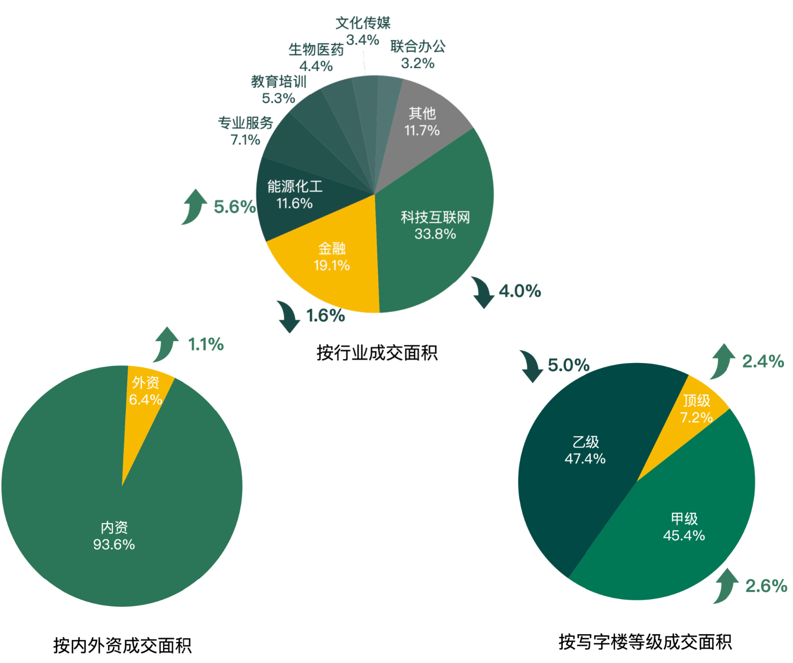 本季度從內外資成交面積來看,外資企業成交面積占比環比上升1.1個百分點,成交數量占比環比上升0.4個百分點,市場成交的核心力量依然是內資企業。